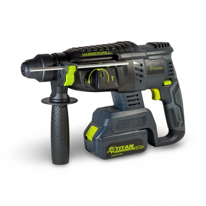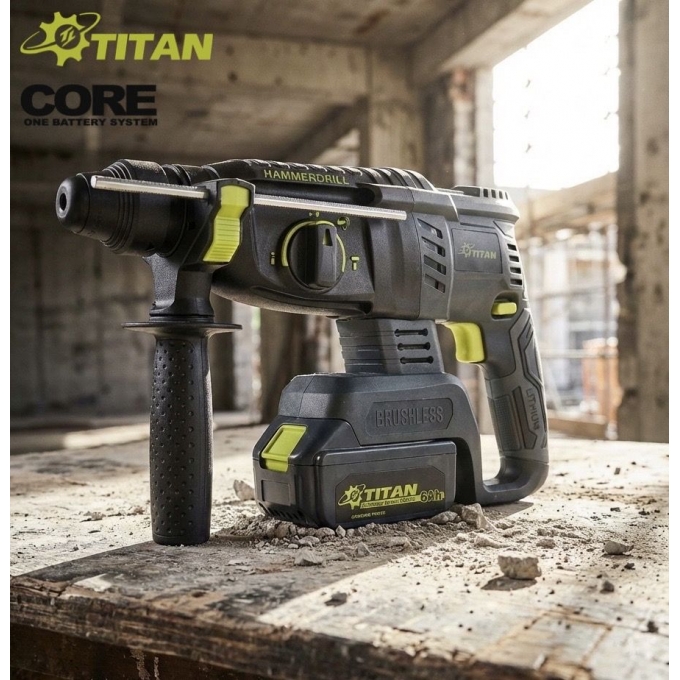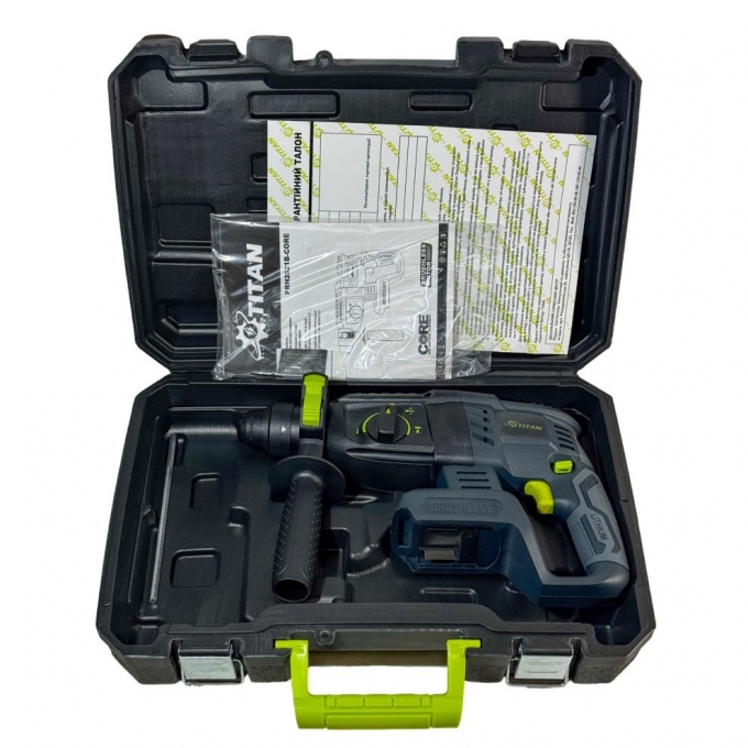 Эргономичная конструкция перфоратора рассчитана на комфортную и безопасную эксплуатацию. Прорезиненная рукоятка снижает уровень вибрации и обеспечивает уверенный хват. Дополнительная боковая рукоятка помогает точно контролировать инструмент при высоких нагрузках. Вес перфоратора с аккумулятором 5 А·ч составляет около 3,3 кг, что сохраняет баланс между мощностью и удобством. Прочный пластиковый чемодан облегчает транспортировку и хранение оборудования. Поставляется без зарядного устройства и без аккумулятора, что важно учитывать при выборе комплектации. Такой формат поставки удобен для пользователей, уже имеющих батареи системы TITAN CORE.