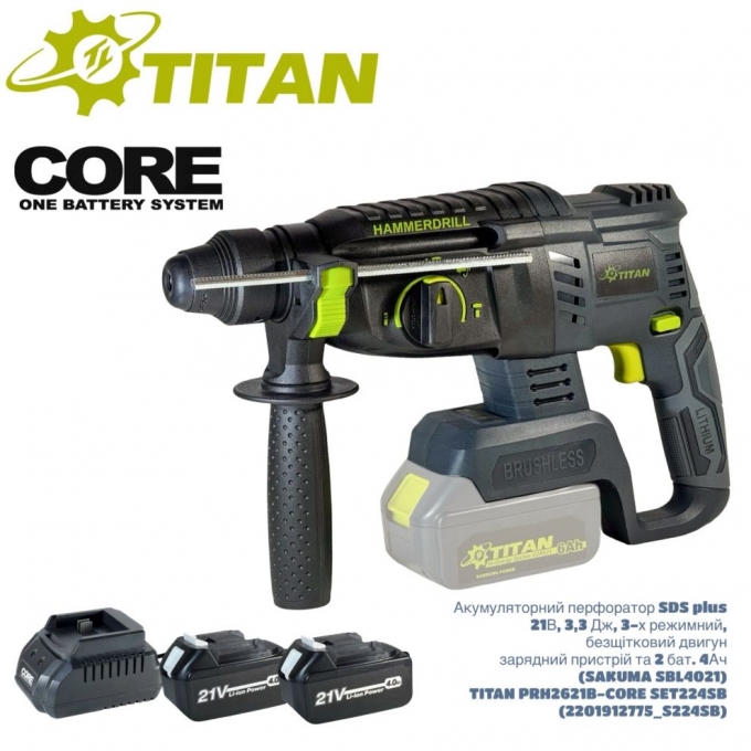 Перфоратор TITAN PRH2621B-CORE SET224SB SDS plus, 21В, 3,3 Дж, 3-х режима, 2 батареи 4Ач (SAKUMA SBL4021) и з/у (2201912775_S224SB) × 1