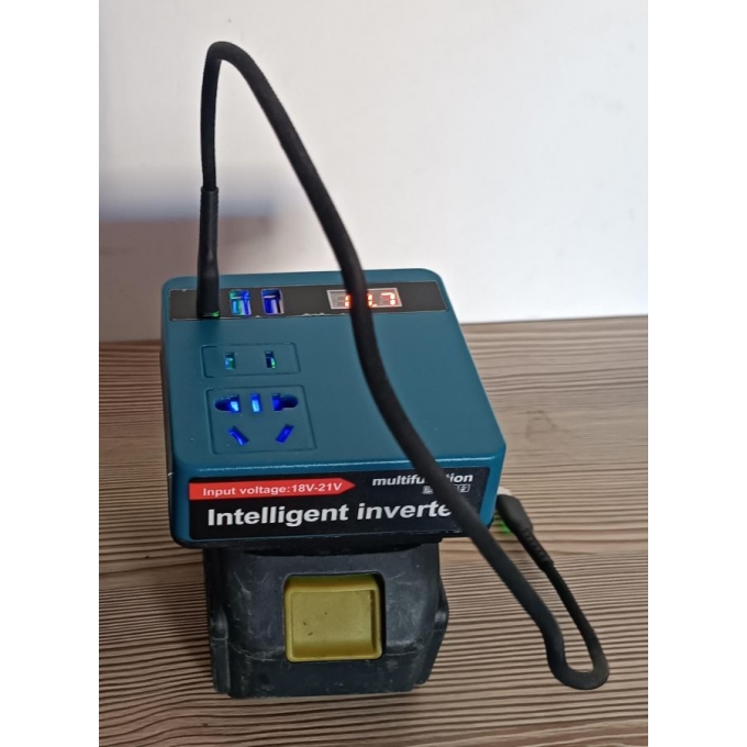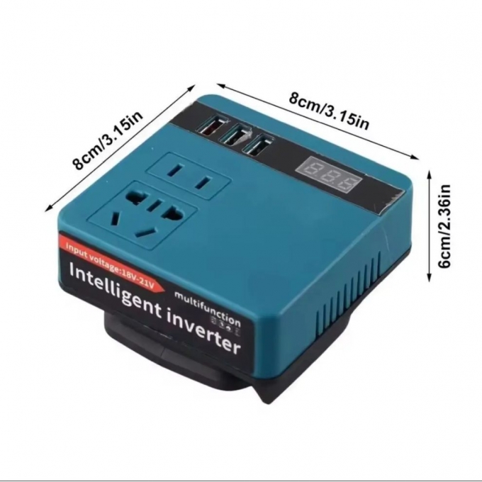 Устройство оснащено стандартной розеткой 220V и USB-портом для зарядки мобильных гаджетов. Инвертор выдает мощность 120W с допустимой пиковой нагрузкой до 300W. Используется тип преобразования с модифицированной синусоидой. Предусмотрены встроенные системы защиты от перегрева, перегрузки и короткого замыкания. Также реализована защита от чрезмерного разряда аккумуляторной батареи. Корпус выполнен из прочных материалов и рассчитан на эксплуатацию в условиях выездных работ. Совместимость с аккумуляторами формата 18-21V делает модель универсальной для пользователей электроинструмента.