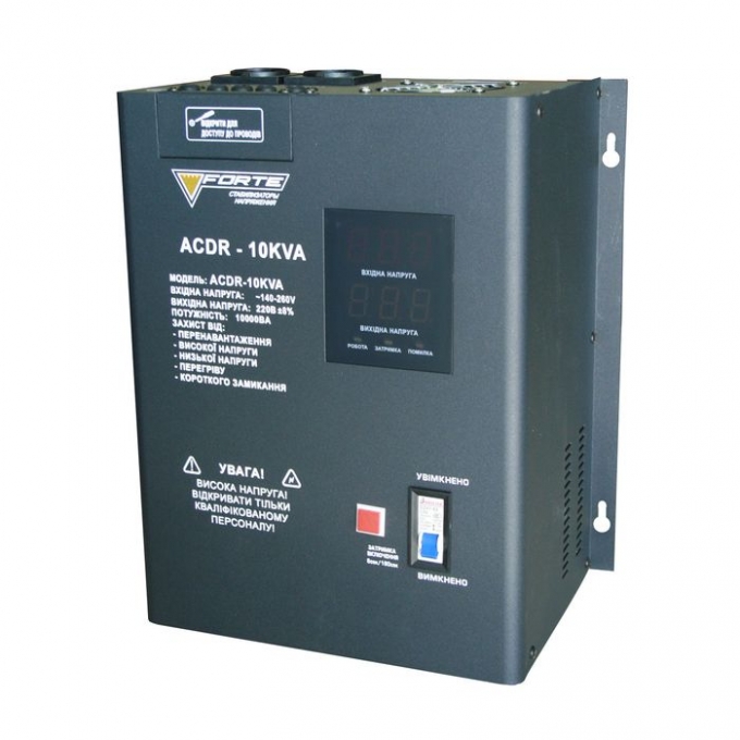 Стабилизатор FORTE ACDR-10kVA является качественным и надежным однофазным стабилизатором напряжения релейного типа с цифровым вольтметром входного и выходного напряжения. Имеет мощный трансформатор который способный питать дом или же квартиру. Контроль входного напряжения осуществляется микропроцессором, благодаря чему стало возможное более точное и стабильное напряжения на выходе. Данный стабилизатор оснащен набором разного типу защит цель которых защитить вашу электросеть от скачков напряжения. При срабатывании одной из защит стабилизатор мгновенно и самостоятельно возобновит работу. Компактные размеры и небольшой вес позволяют устанавливать стабилизатор в любое удобное для вас место. Все силовые контакты сделаны из серебра, что предотвращает залипание контактов и увеличивает их срок службы. В данного стабилизатора установлена кнопка отключающая задержку перед включением.