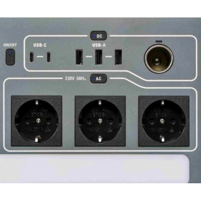 Зарядная станция оснащена девятью выходными портами для одновременного подключения нескольких устройств. В их числе розетки переменного тока, USB-A и USB-C с поддержкой высокой мощности, а также разъем автомобильного типа. Технология быстрой зарядки NitroGo позволяет восполнить до 80% емкости за короткое время. Полная зарядка от сети занимает около 1,2 часа, что удобно при активной эксплуатации. Дополнительно предусмотрена возможность зарядки от солнечных панелей, генератора или автомобильной сети. Частота выходного тока 50 Гц соответствует стандартам бытовой техники. Oleo-Mac PSi 1650 станет надежным источником энергии в самых разных условиях.