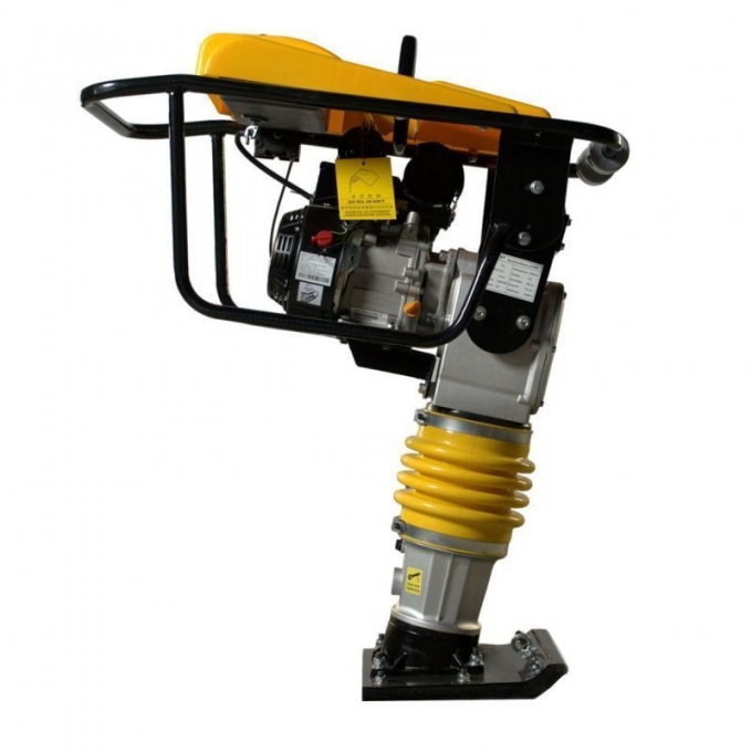 Запуск двигателя осуществляется с помощью ручного стартера, что упрощает эксплуатацию в любых условиях. Корпус двигателя и рукоятка изолированы от рабочего механизма при помощи мощных пружин и резиновых демпферов. Такое конструктивное решение значительно снижает вибрационные и ударные нагрузки на оператора. Узкая и удлиненная подошва размером 320×280 мм обеспечивает точную работу в ограниченном пространстве. Прямоходный тип конструкции позволяет легко контролировать процесс уплотнения. Эргономичная форма рукоятки повышает комфорт при длительной работе. Вес 80 кг делает виброногу достаточно устойчивой и одновременно удобной для перемещения.