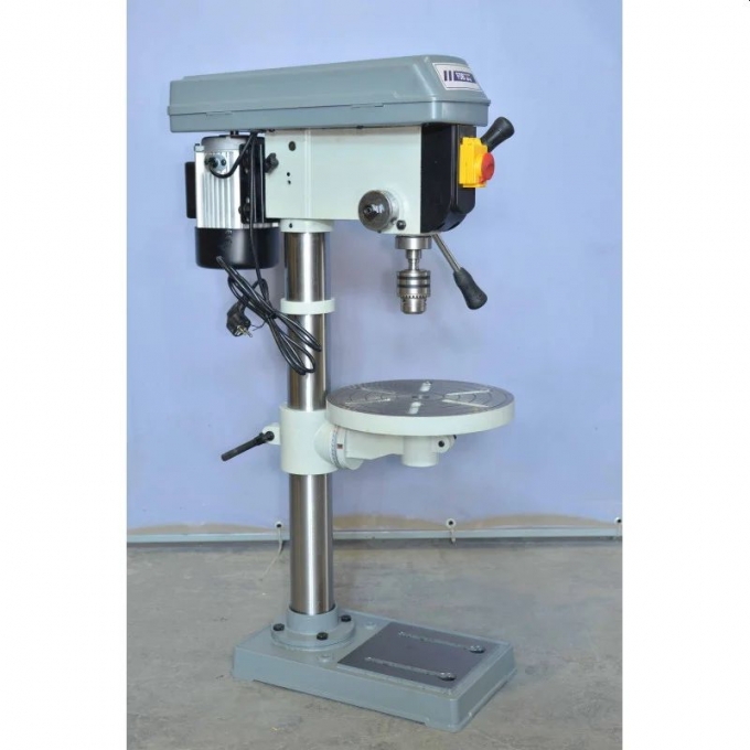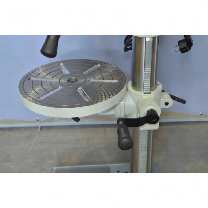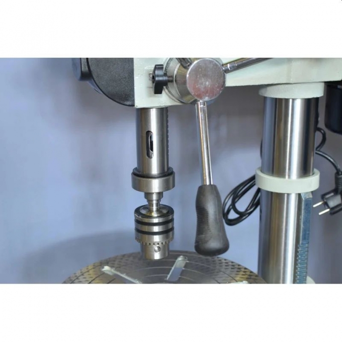 Отличительной особенностью модели является увеличенный ход пиноли до 82 мм, что расширяет возможности обработки заготовок разной высоты. Диаметр колонны 72 мм повышает жесткость конструкции и снижает вибрации при работе. Расширенный диапазон скоростей вращения шпинделя от 220 до 2840 об/мин позволяет подобрать оптимальный режим под конкретный материал. Всего предусмотрено 16 скоростей, что повышает гибкость использования. Шпиндель установлен на высокоточных шарикоподшипниках, обеспечивая плавность и стабильность хода. Быстросменный сверлильный патрон входит в комплект поставки и упрощает замену инструмента. Электродвигатель мощностью 375 Вт работает тихо и отличается стабильной производительностью.