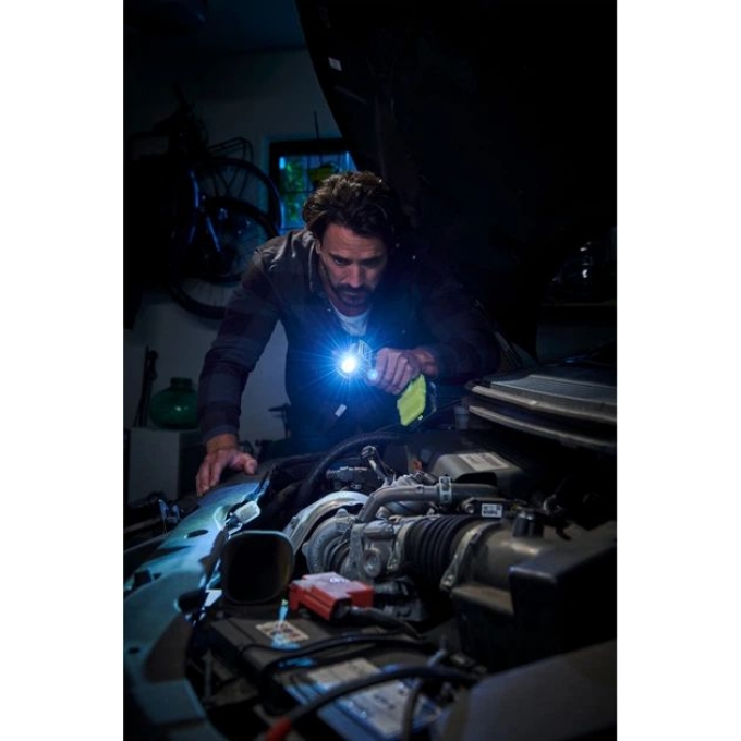 Модель оснащена нахильним рефлектором, який дозволяє легко регулювати напрям світлового потоку та обирати найзручніший кут освітлення. Універсальна конструкція дає можливість встановлювати ліхтар на рівну поверхню або підвішувати його на гвіздок, шуруп чи гак, що дуже зручно в умовах обмеженого простору. Ручка має еластичне неслизьке покриття, завдяки чому ліхтар комфортно тримати навіть під час тривалої роботи.