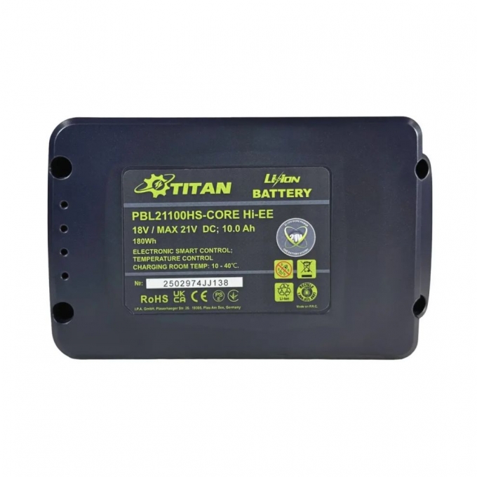 Акумуляторна батарея TITAN PBL21100HS 21В 10Ач — сучасне рішення для забезпечення автономної роботи електроінструменту. Модель сумісна з системою TITAN CORE 21, а також з більшістю інструментів 18-21В через опціональні адаптери, що робить її універсальною для дому та майстерні. Високоточні елементи Samsung21700 гарантують стабільну роботу та тривалий термін служби батареї. Вбудована система захисту контролює рівень заряду, температуру та струм, підвищуючи безпеку експлуатації. Батарея підтримує швидку зарядку, а вбудований чіп пам’яті синхронізується з зарядним пристроєм, оптимізуючи процес заряджання. Завдяки ємності 10 Ач ви зможете працювати з інструментом довше без необхідності частого підзаряджання. Компактна вага у 1 кг робить батарею зручною для перенесення та встановлення на інструмент.