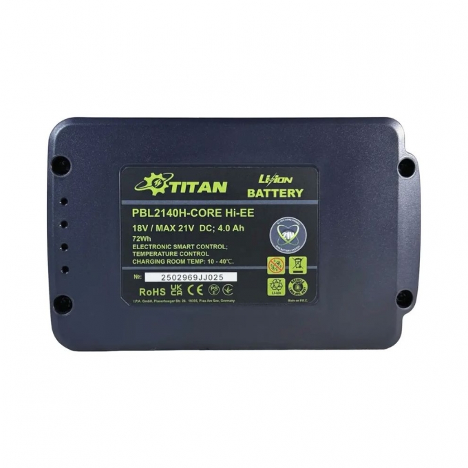 Батарея акумуляторна TITAN PBL2140H-CORE Hi-EE 21В 4Аг створена для стабільної та безпечної роботи електроінструменту в різних умовах. В основі моделі використовуються високоточні елементи формату 21700 від виробника EVE, що забезпечує впевнену віддачу струму та надійність при навантаженнях. Максимальна напруга становить 21 В, робоча — 18 В, що відповідає стандарту інструментів системи TITAN CORE 21. Ємність 4.0 Аг оптимальна для тривалих робіт без частих перерв на підзаряджання. Літій-іонна технологія гарантує відсутність ефекту пам’яті та стабільну продуктивність протягом усього терміну служби. Батарея оснащена індикатором рівня заряду та системою індикації помилок для зручного контролю стану. Вага лише 0,5 кг робить акумулятор зручним для щоденного використання без зайвого навантаження на інструмент.