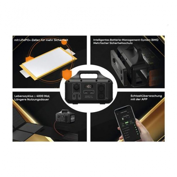 Модель відрізняється продуманим набором виходів для підключення різних пристроїв. Серед них — два виходи змінного струму, порти USB-C та USB-A, а також роз’єми DC5525 і DC7909, що розширює можливості застосування. Компактні розміри та вага всього 6,5 кг дозволяють легко транспортувати електростанцію. Корпус із міцного ABS+PC матеріалу захищає внутрішні елементи та забезпечує довговічність. LiFePO4 батарея з ресурсом понад 4000 циклів гарантує тривалий термін служби. Електростанція оснащена LED-дисплеєм і можливістю контролю через застосунок, що підвищує зручність експлуатації. Bluepalm BP-S500F поєднує в собі надійність, універсальність та простоту у використанні.
