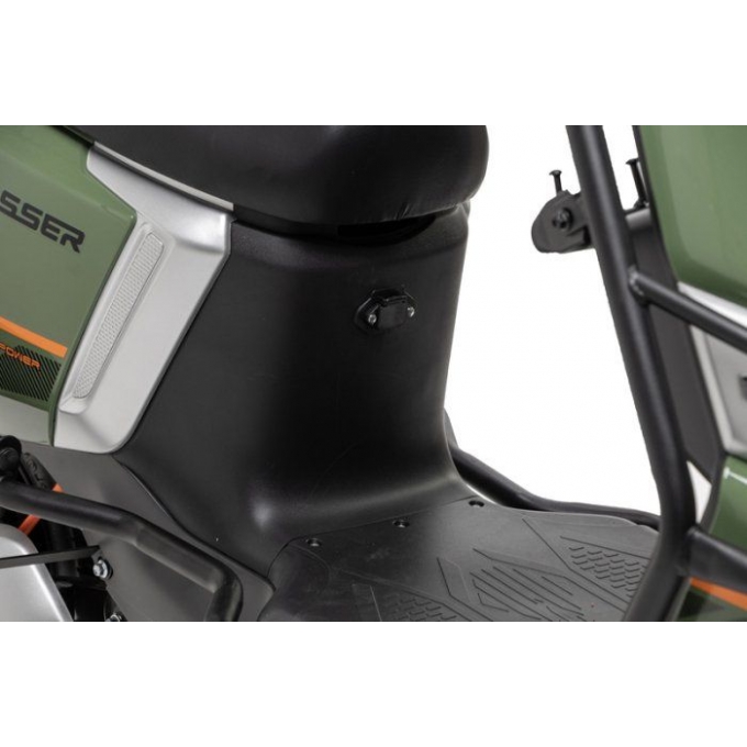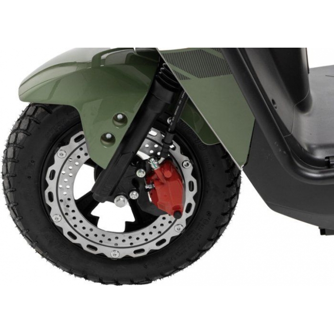 Модель оснащена передніми та задніми дисковими гідравлічними гальмами, що забезпечує точне та безпечне гальмування в різних дорожніх умовах. Телескопічна передня вилка ефективно поглинає нерівності покриття. Задня маятникова підвіска з двома гідравлічними амортизаторами підвищує комфорт під час поїздок удвох. Безкамерні шини розміром 10×3.0 встановлені на легкосплавних дисках і розраховані на щоденну експлуатацію. Сталевий бампер посилює захист корпусу та зменшує ризик пошкоджень. Електроскутер розрахований на двох пасажирів із максимальною вагою до 150 кг. Продумана ергономіка забезпечує зручність як для водія, так і для пасажира.