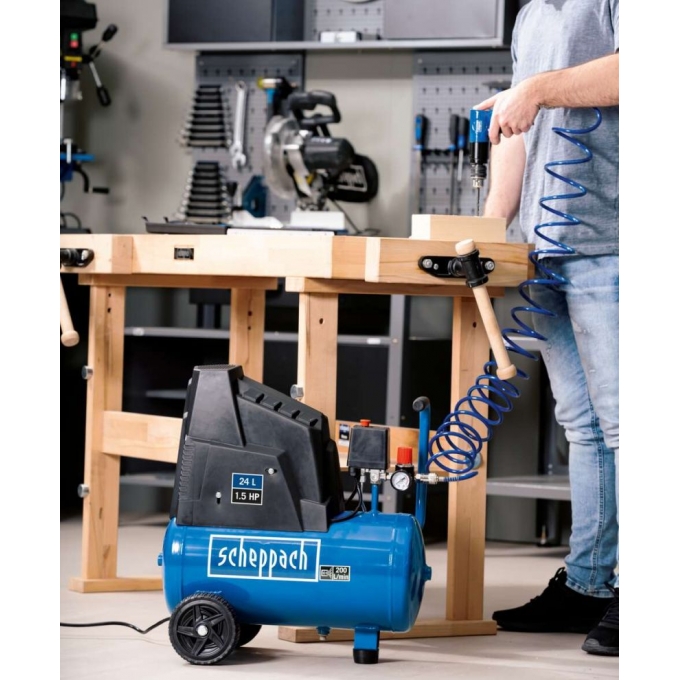 Scheppach HC30o забезпечує продуктивність до 200 л/хв, що достатньо для накачування шин, продувки та роботи з цвяхозабивними пістолетами. Вбудований манометр дозволяє контролювати тиск у ресивері в реальному часі. За потреби робочий тиск легко налаштовується за допомогою редуктора. Швидкоз’ємне з’єднання дає змогу швидко змінювати пневматичний інструмент без зайвих затримок. У комплекті передбачено 5-метровий спіральний шланг, що розширює робочий радіус. Компресор працює стабільно і підходить для регулярного домашнього використання. Він розрахований на тривалу та безпечну експлуатацію.